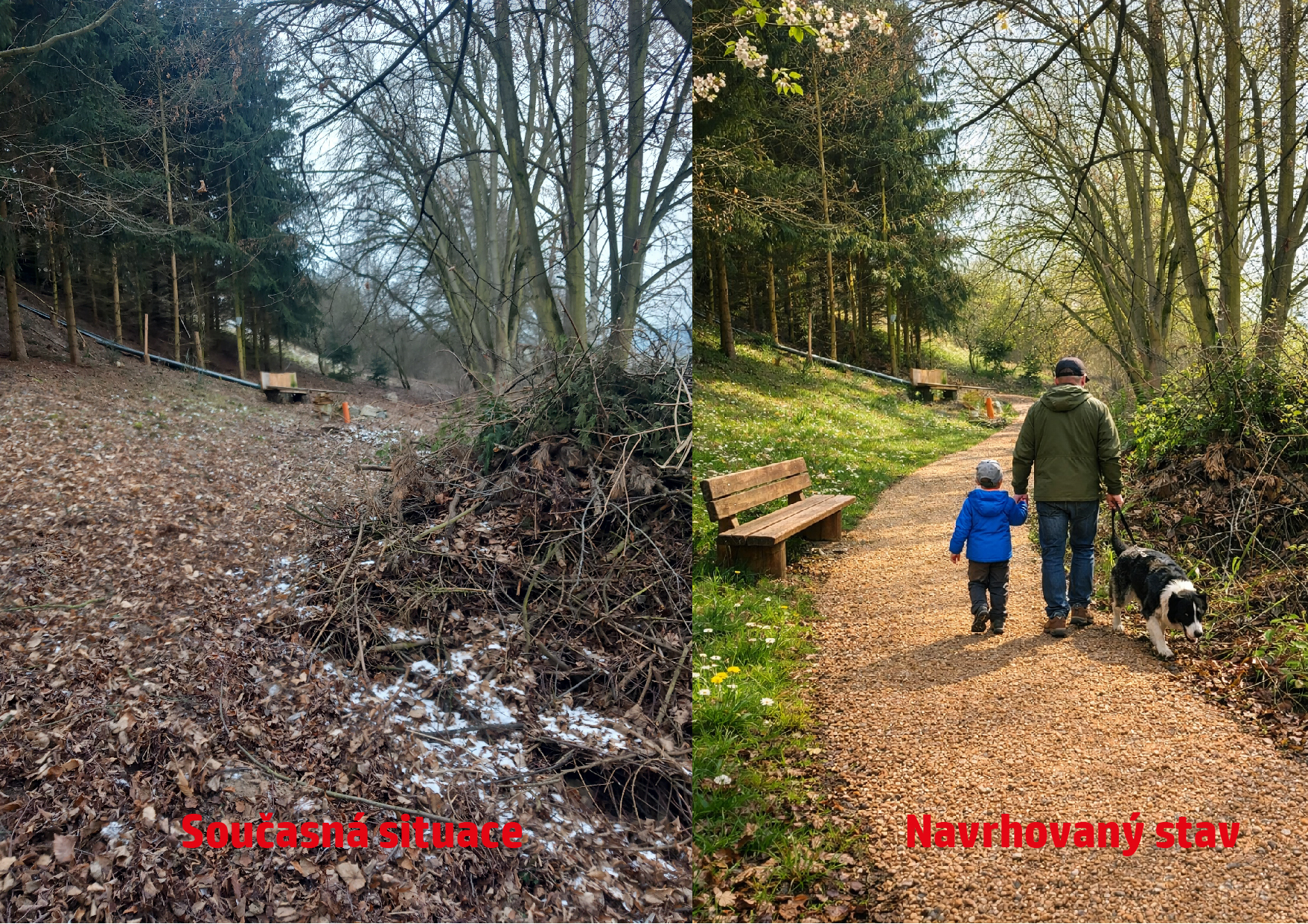 V současné době je mnou navrhovaná cesta neprůchodná a lidé tak vyšlapali pěšinu přes území louky, která není ve vlastnictví města. Ta je však v úrovni rybníka Papež a po většinu roku je podmáčená. Obnovením a zvelebením této části okolo rybníku Papež dojde k zpřístupnění a zpříjemnění vycházkové trasy v tomto oblíbeném místě, jak pro rodiny s dětmi, maminky s kočárky, tak i seniory, neboť zde navrhuji také několik laviček.