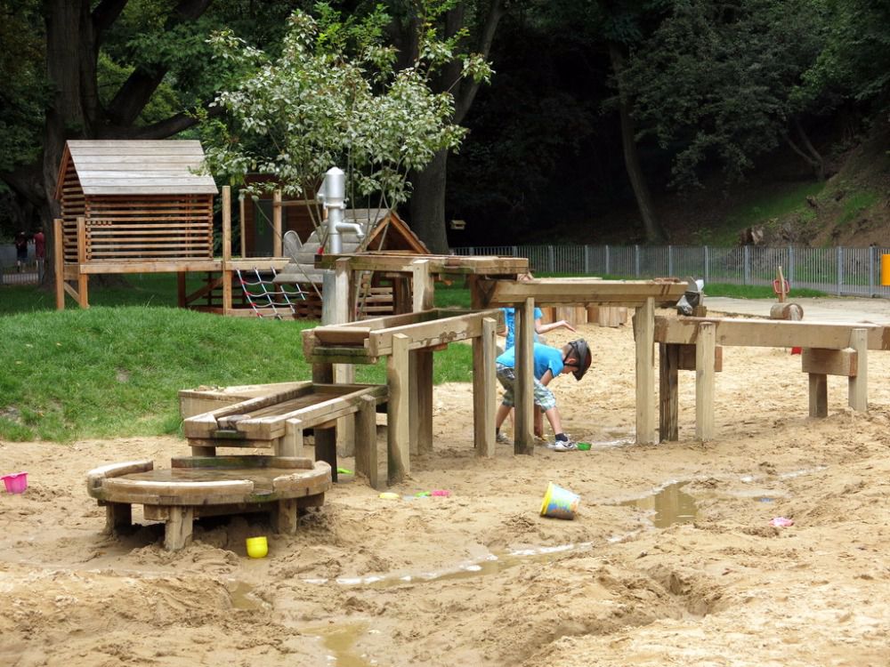 Dětské hřiště s vodními prvky - soustava dřevěných koryt na vodu s pumpou včetně vybavení v podobě vodních hraček/náčiní.
