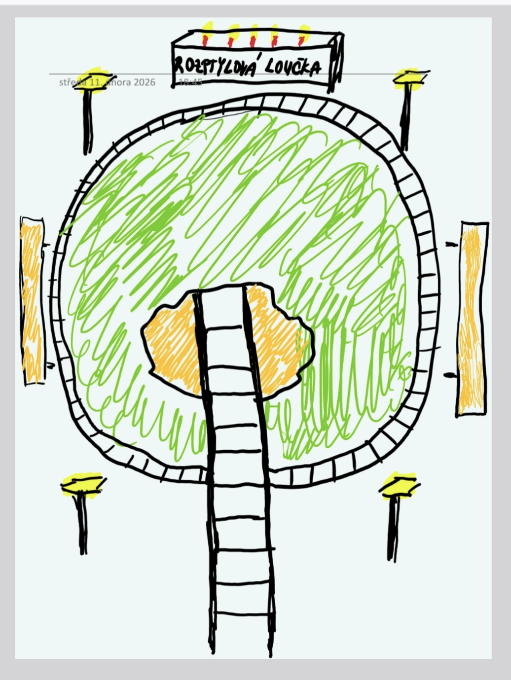 ke středu kruhu bych udělala dlaždicový chodníček s dřevěnou podestou, aby pracovníci pohřební služby měli lepší přístup a místo k rozptylu. Kolem loučky navrhuji osvětlení v podobě 4 solárních lamp a umístit 2 lavičky, nejlépe z přírodního dřeva, klády atd.