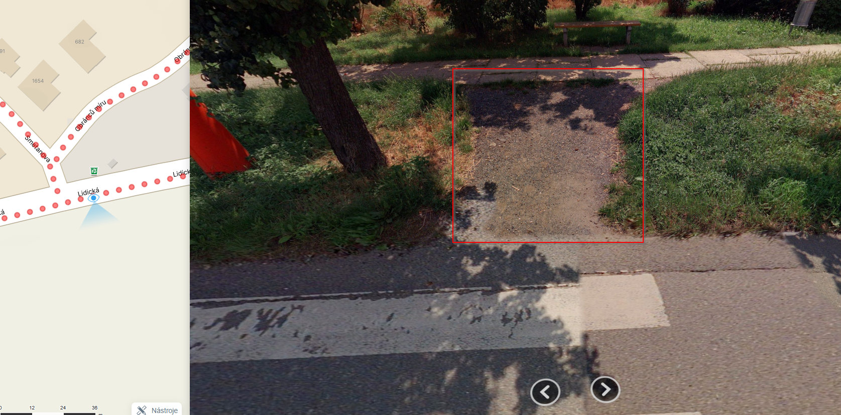Položení panelu, asfaltu nebo jiným způsobem zpevnění kousku mezi přechodem pro chodce na křižovatce Lidická - Obránců míru.