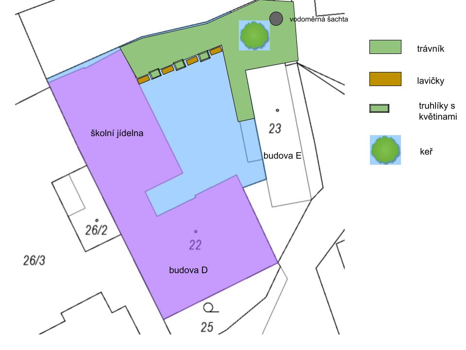 Prostor před školní jídelnou je v současné době zpevněn zámkovou dlažbou. Plochy od zámkové dlažby k plotu pozemku jsou neupravené a nepřízpusobené pro případné využití čekajícími dětmi. Zatravněním ploch a vybavením prostoru se zlepší možnost využití pro děti i rodiče.