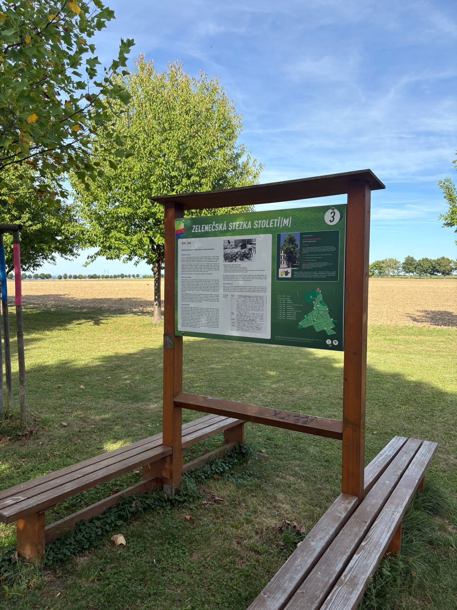„Stezka stoletím“ byla vybudována jako místní naučná trasa s informačními panely o historii a přírodě Zelenče. V současnosti je část mobiliáře (lavičky, panely) opotřebovaná vlivem času a počasí. Navrhovaná obnova zahrnuje výměnu poškozených laviček (cca 3–4 kusy), opravu nebo výměnu informačních panelů (nové desky, úprava stojanů), doplnění drobných herních a edukačních prvků u vybraných zastavení (např. dřevěný xylofon nebo motorická deska dle nabídky www.skluzavky.cz), vysypání ploch pod lavičkami a kolem stromů kačírkem pro zamezení prorůstání trávy a zlepšení vzhledu zastavení, drobnou úpravu okolí (úklid, nátěr dřevěných částí, doplnění chybějících šroubů apod.)