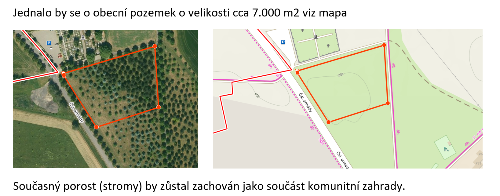 Vybudování komunitní zahrady se zvířecím minikoutkem v lokalitě na obecním pozemku před hřbitovem na kraji obce, kde je i vhodné parkoviště a klidová zóna. Jednalo by se o obecní pozemek o velikosti cca 7.000 m2 viz mapa v přiloženém dokumentu.